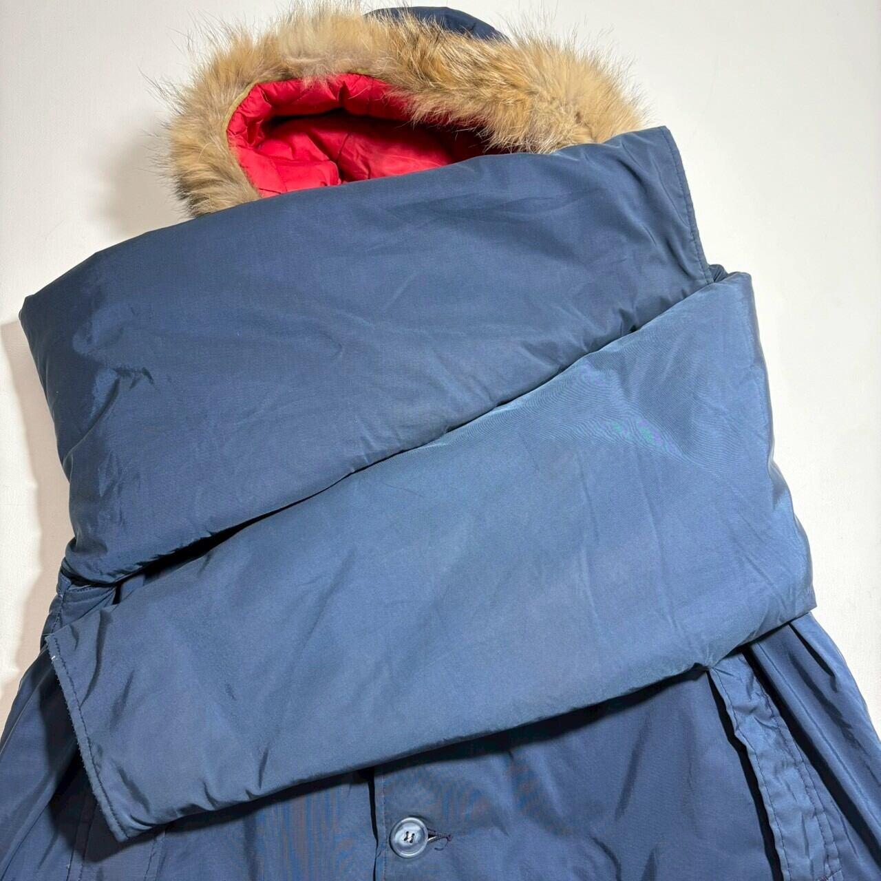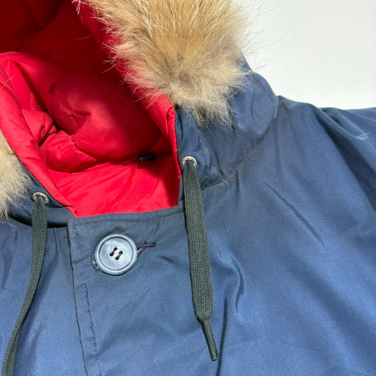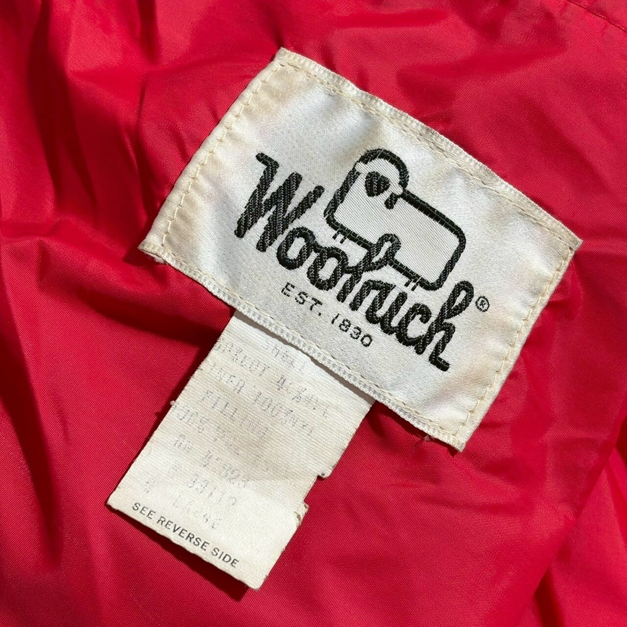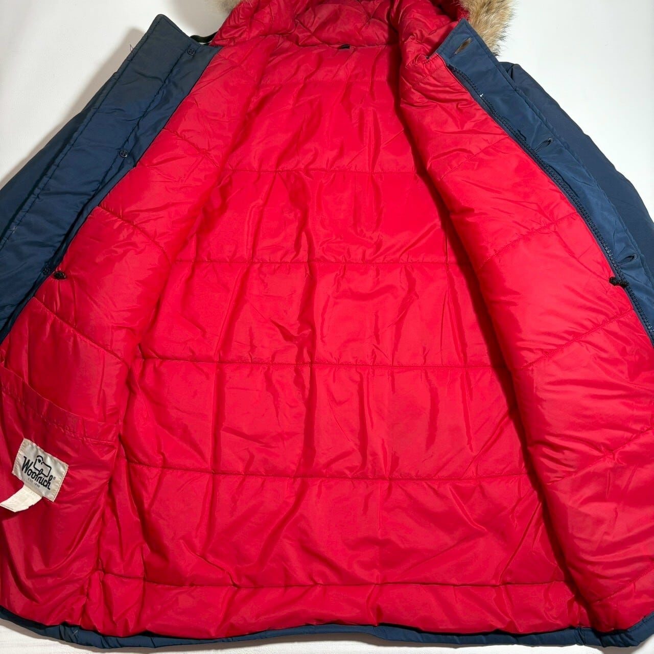 ネイビーに裏地の赤が光る白タグ装備のウールリッチ。