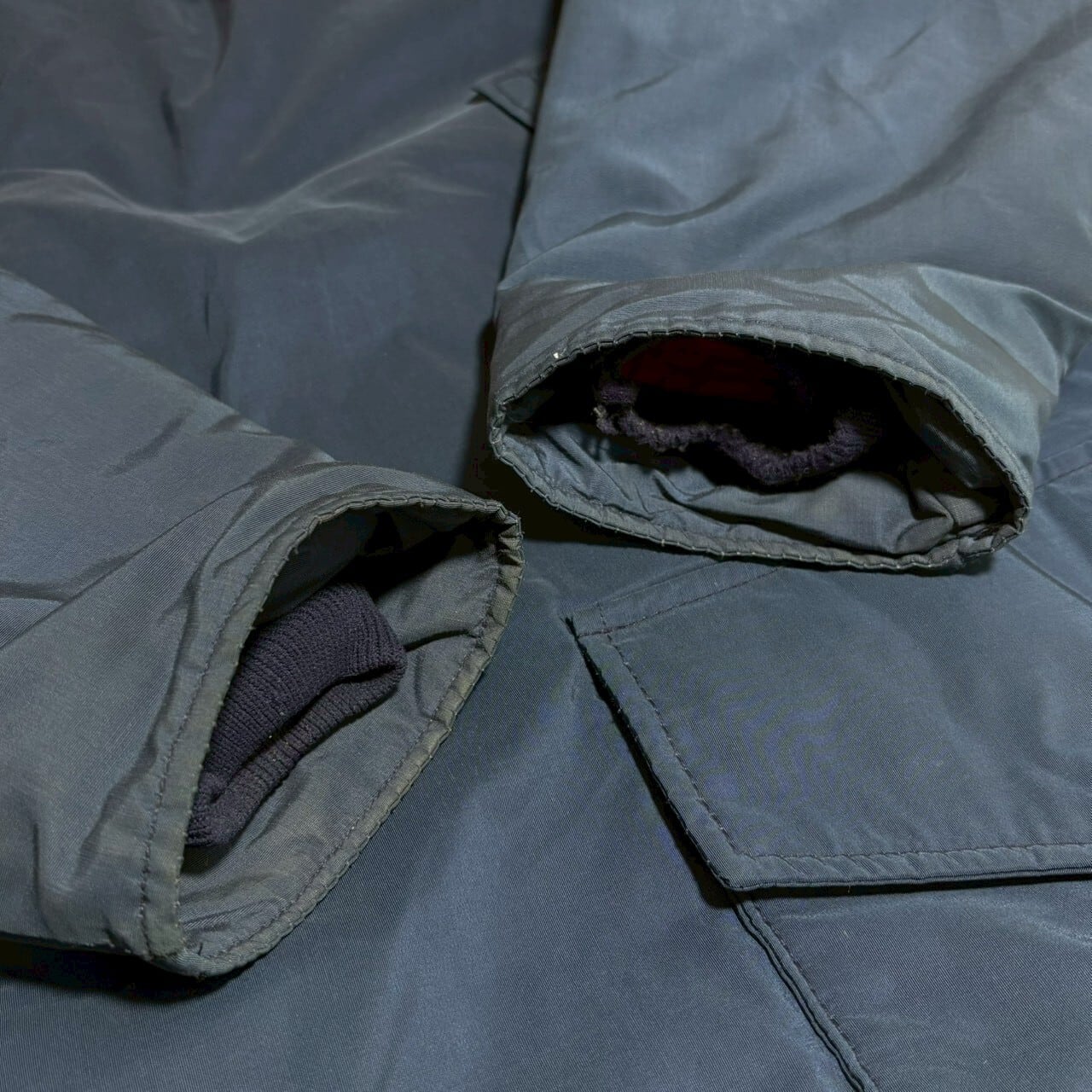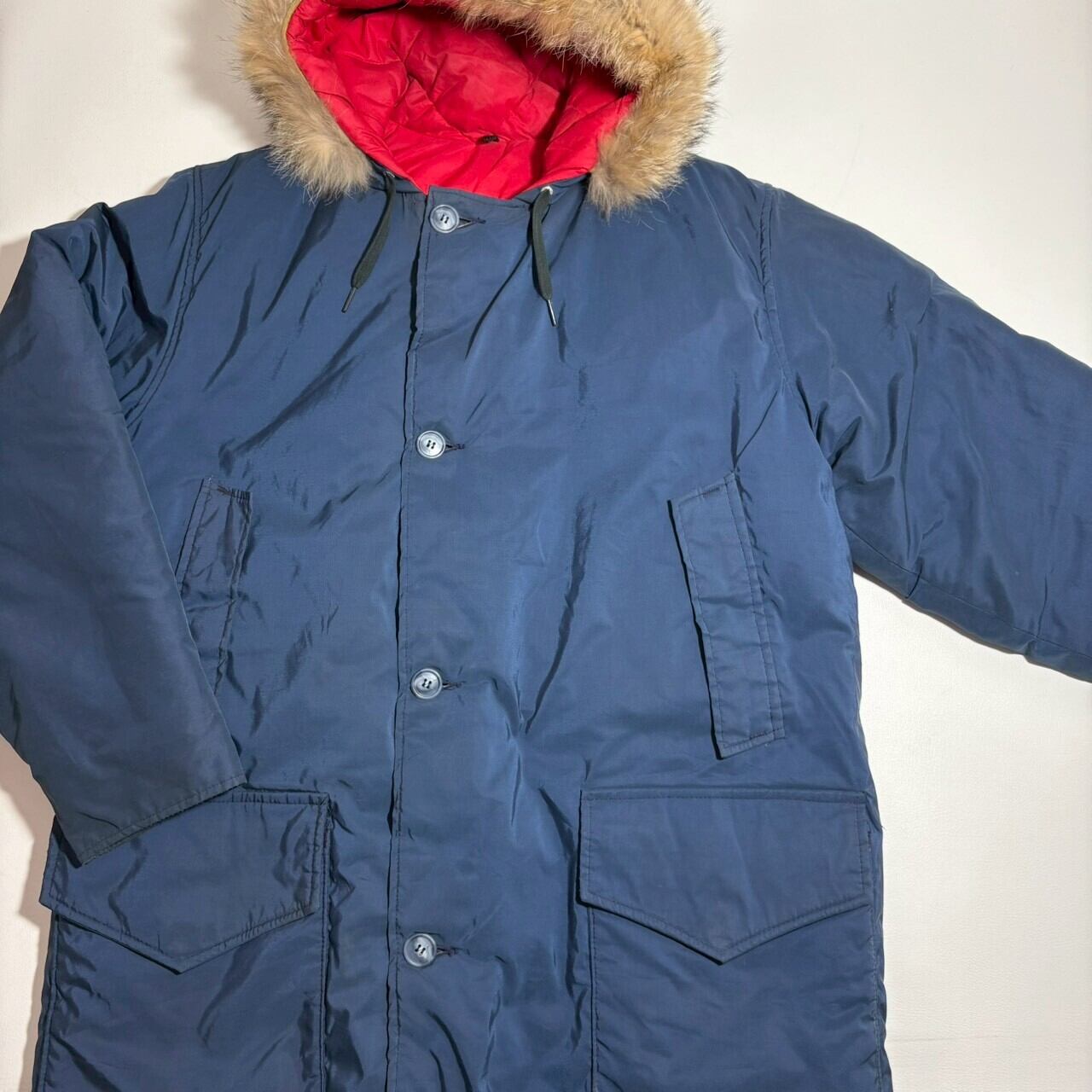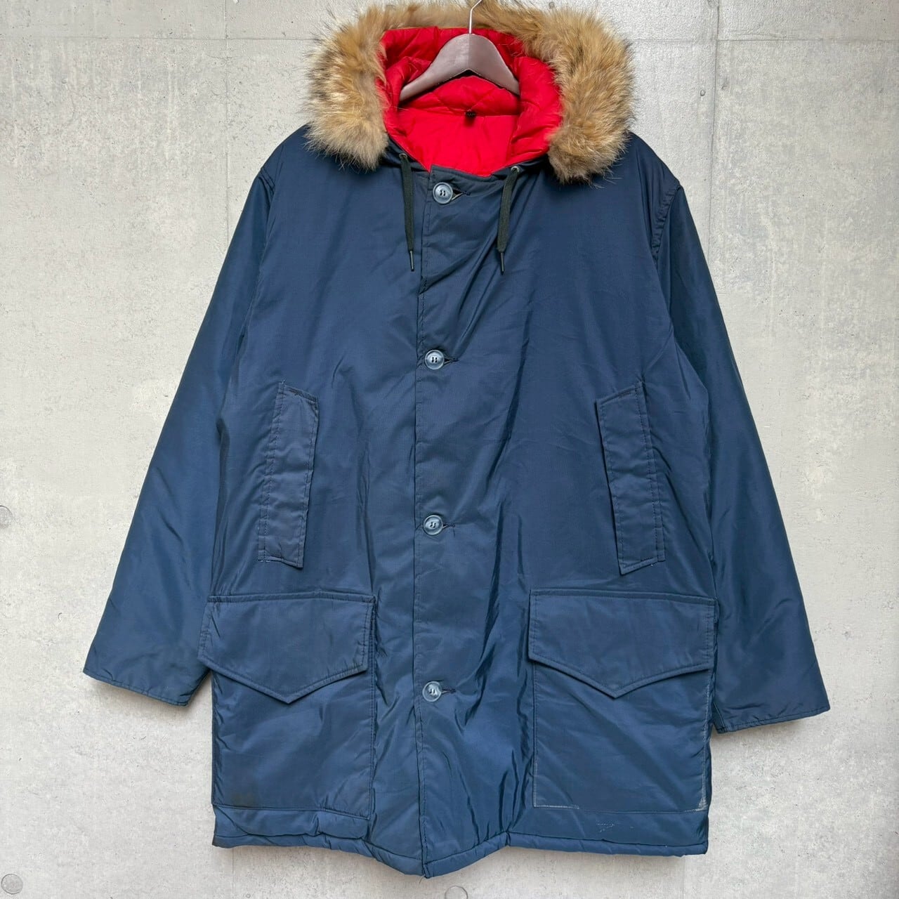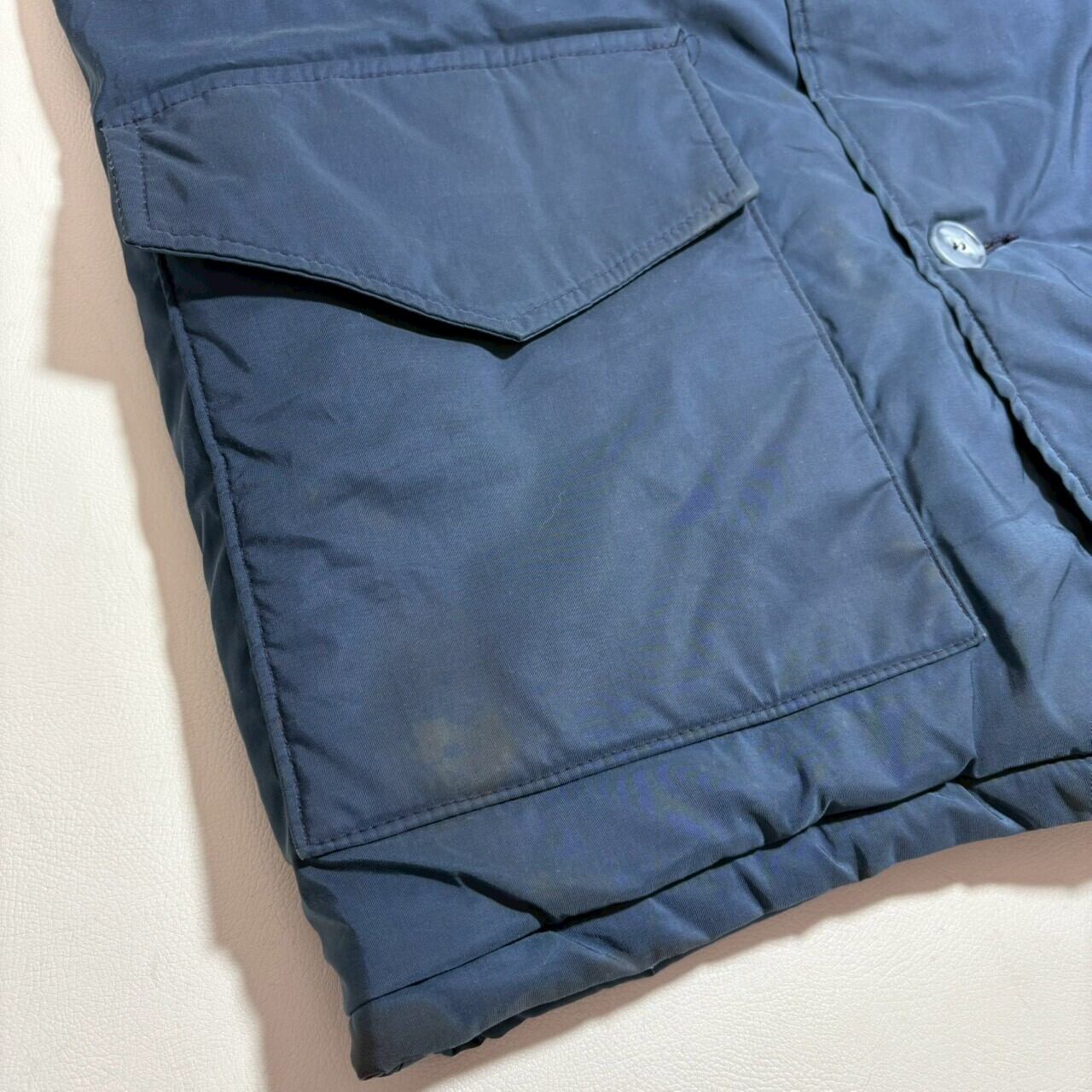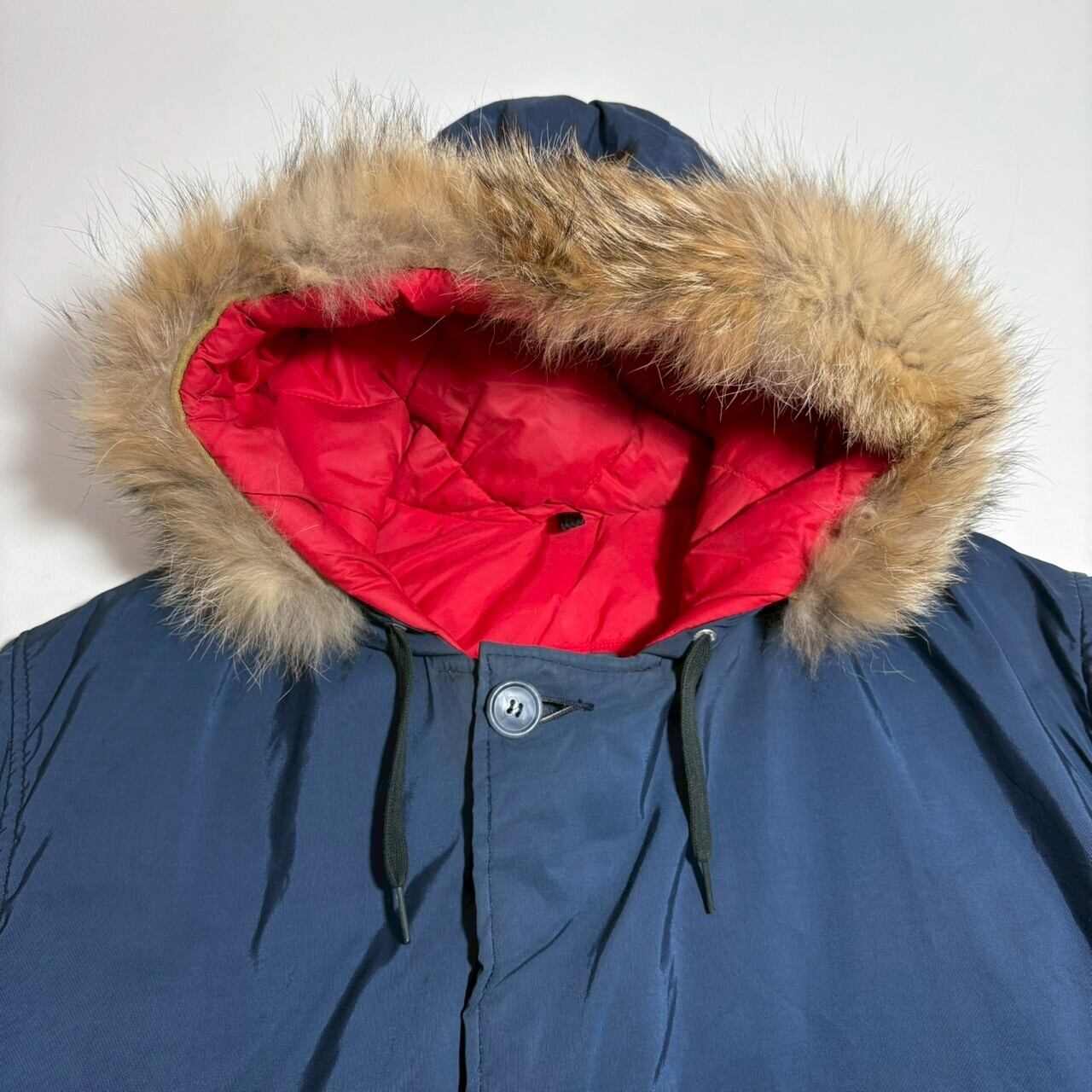 ネイビーに裏地の赤が光る白タグ装備のウールリッチ。