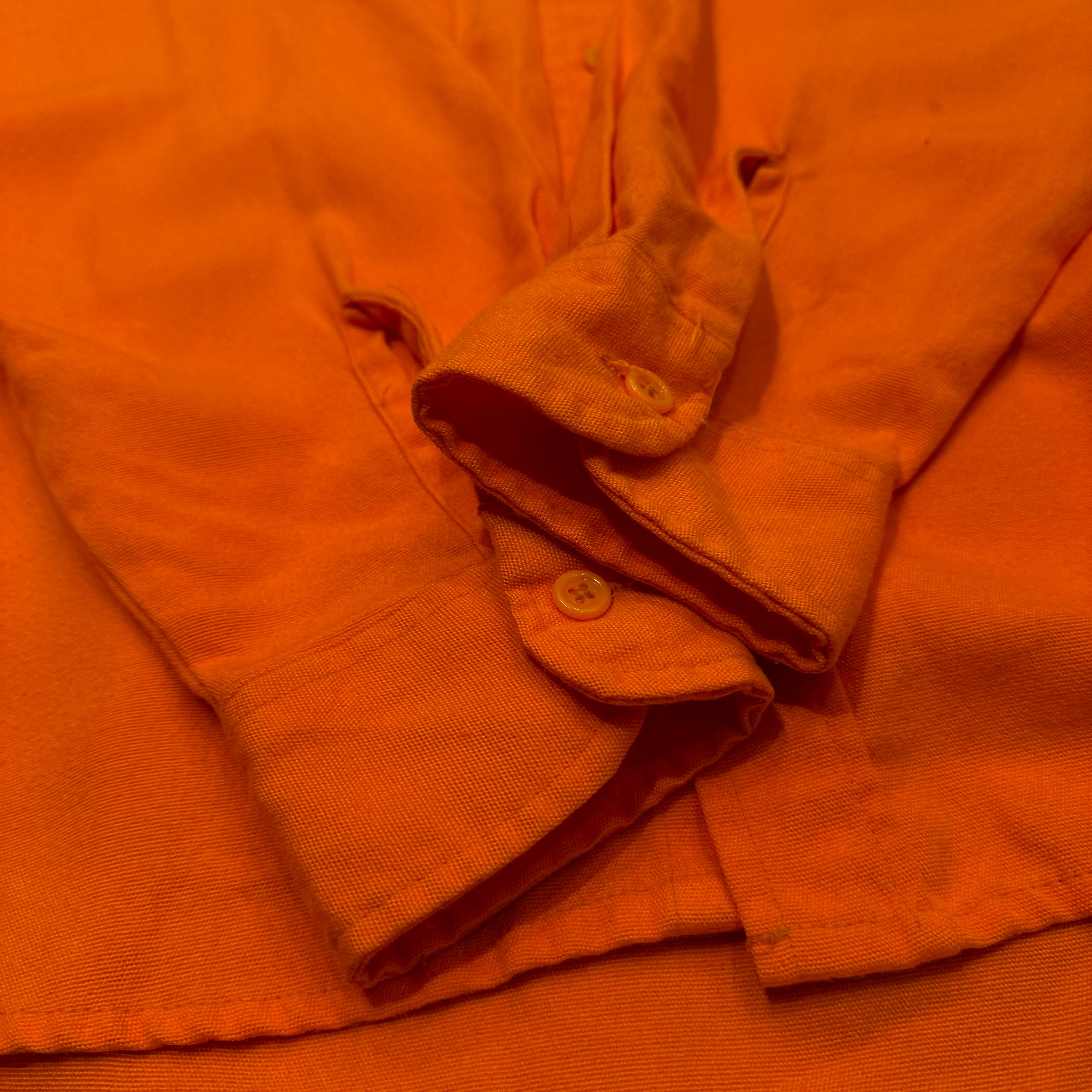 目が覚めるようなオレンジのワークシャツ。