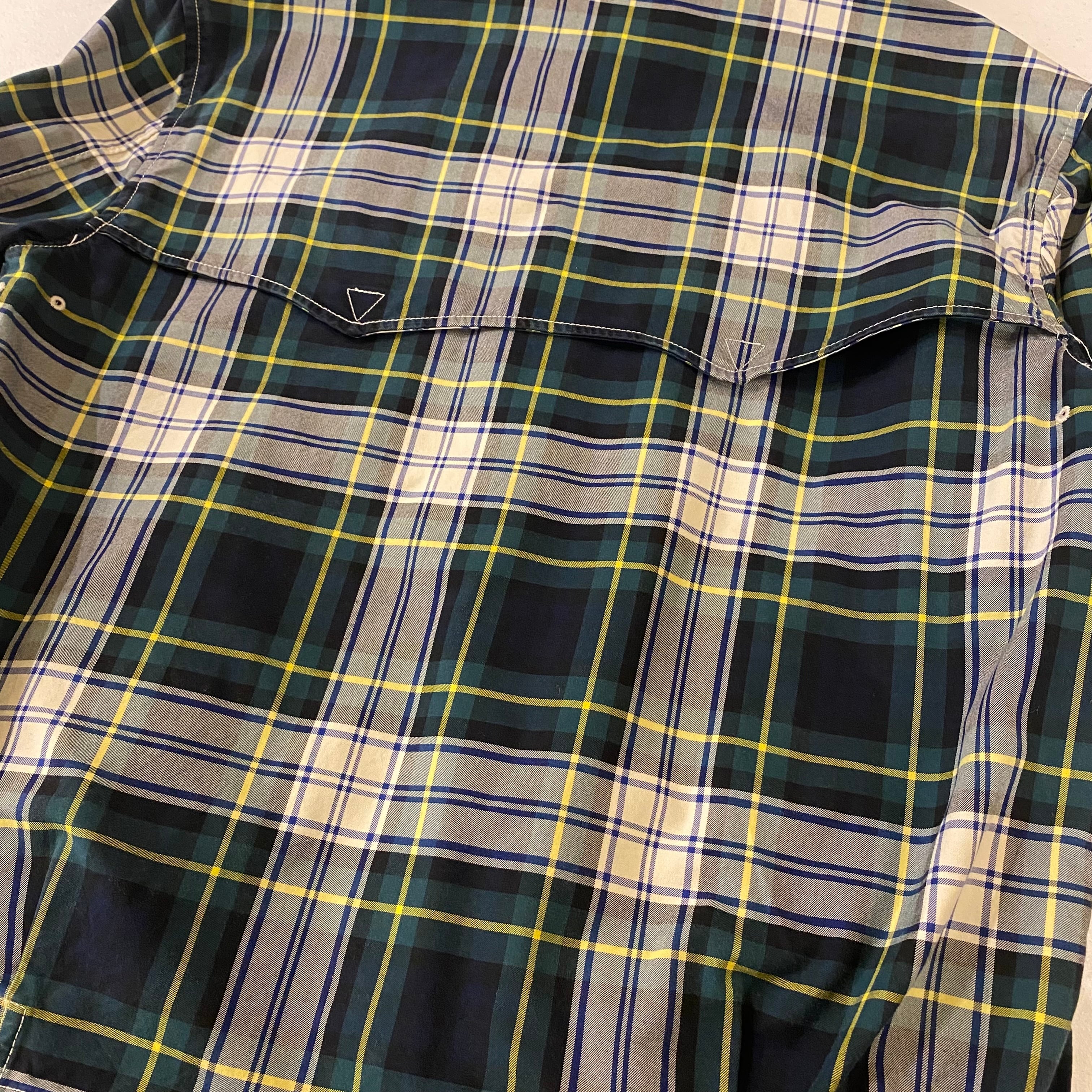 胸ポケ付きの緑ベースのチェック柄!